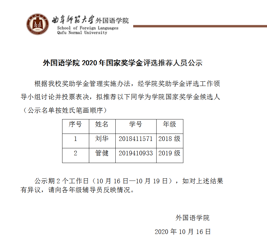亚洲杯投注 2020年国家奖学金评选推荐人员公示