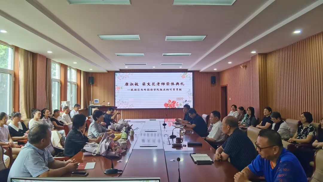 206会议室隆重举行了康淑敏教授和梁文花教授的荣休典礼。外院全体教职工齐聚一堂,共同见证了这一荣耀时刻。