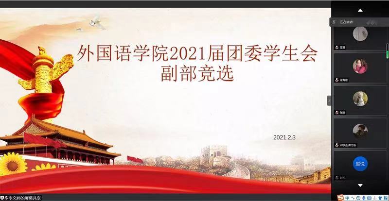 于线上举行团委学生会副部竞选活动。本次竞选面试由辅导员冀玉珍、张晓、王伟、赵文彬,团委学生会2020届各部门部长、2021届主席团及各部长分小组担任评委,各部门干事积极参与。