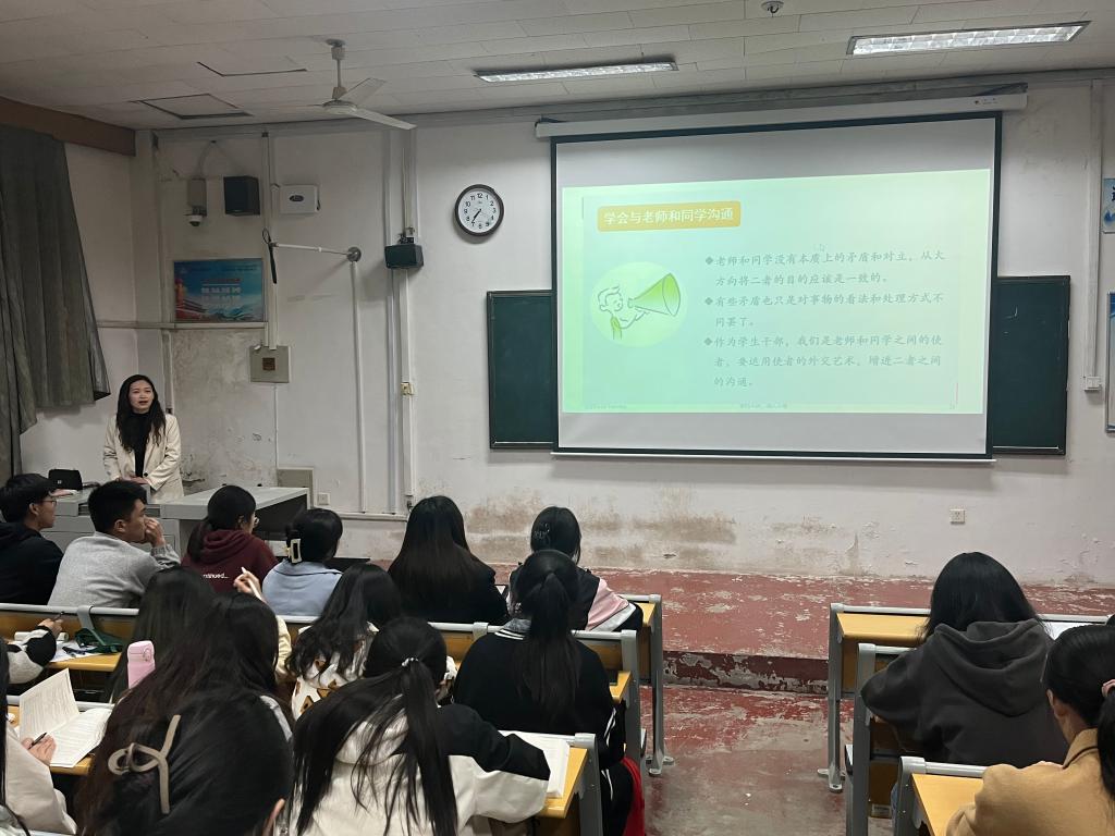 会上,王伟老师首先从“什么是学生干部”、“为什么成为学生干部”两个问题与同学们进行交流,提出学生干部作为学生与老师之间的桥梁与纽带应把提升自己能力和服务老师同学为目的,树立正确的工作态度。接着,老师耐心地询问参会学生干部们生活中遇到的困难和压力,通过心理压力测试图片和调查问卷进一步了解学生干部们的心理状况,从学习工作、人际关系、就业压力、情感等一系列问题为同学们答疑解惑,建议同学们首先要积极与老师同学沟通,转换角度看问题,互相理解;其次同学们要平衡好学习和工作之间的关系,学会割舍与自我调节;鼓励同学们不要过于焦虑,正确认识自己。