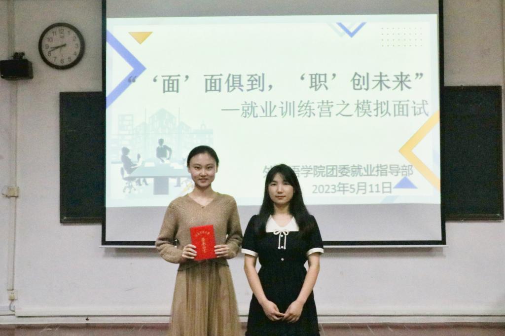 学生会副主席王亚菲、就业指导部部长王迪担任评委,就业指导部志愿者牛晓彤、姜玥担任面试HR。