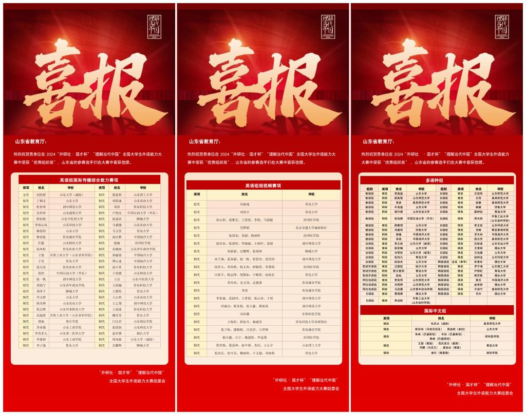 2024“国才杯”“理解当代中国”全国大学生外语能力大赛圆满结束。外院学子们凭借着出色的专业素养,在国赛中斩获了2银2铜的优异成绩,展现了外院学子的独特风采。