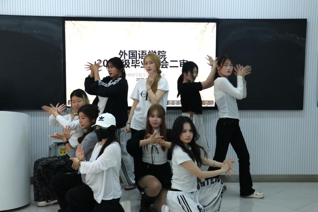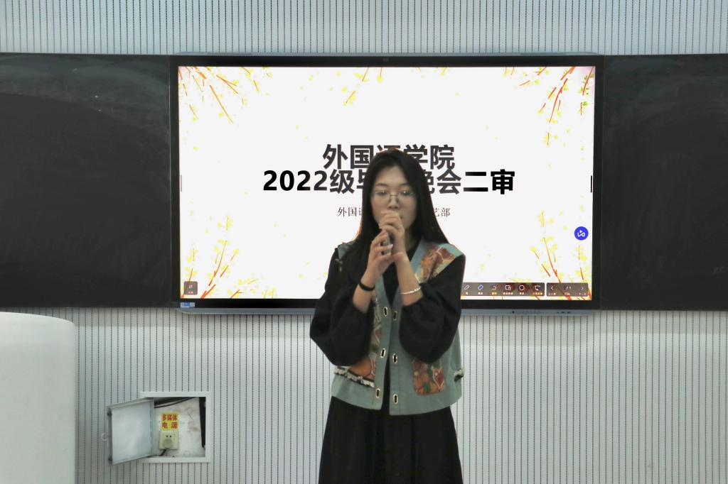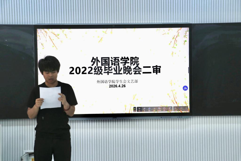 于4月26日在系楼313室开展2022级毕业晚会节目二审工作。2024届学生会主席张嘉怡、文艺部部长王语、2025届文艺部部长刘馨潞、2026届学生会副主席胡晓雨及文艺部部长龙萧羽担任评委。