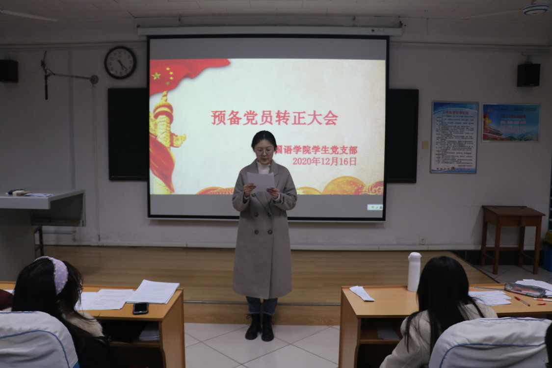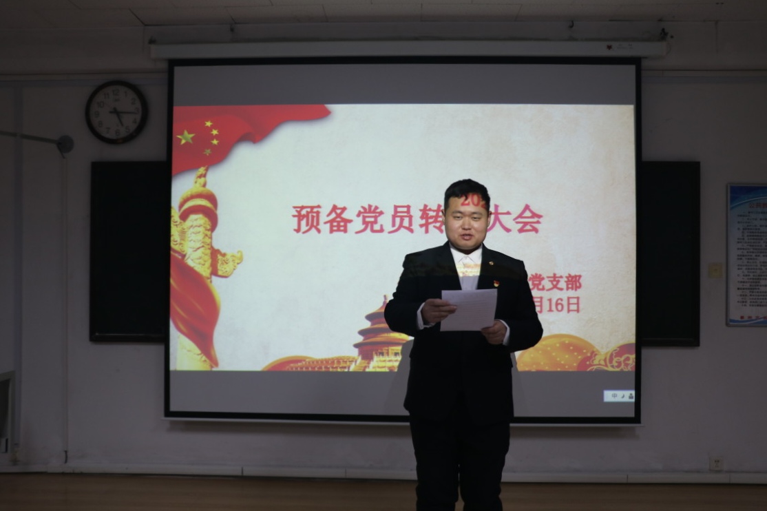 党支部书记张晓对参会人数进行清点,并宣布了党员到会情况。大会首先由申请转正的同志逐一宣读自己的转正申请,详细汇报自己在预备期间的表现,表达入党的志愿和决心,并对自己预备党员期间,在思想、学习和工作上的进步与不足做认真的总结。
