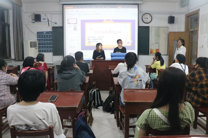 领导和教官的期望,克服大学生活中的第一道难关,走向崭新的大学生活。随后,王伟老师希望新生在军训生活中强身健体,提高身体素质,以饱满的热情投入到军训中,积极展现自我。王老师就学习和自我管理方面向新生寄语,指出大学不仅是接受专业知识的地方,更关乎全面的培养,并鼓励同学们积极主动地去尝试,尽快地适应大学生活和融入到外院大家庭,牢记“学而不厌,诲人不倦”的校训,达到全面发展自身的目标。另外宿管部于201教室向2020级新生们讲解有关内务整理的相关事项,如叠被子、摆放个人物品等。最后,20级辅导员助理带领新生们回到各自的教室,耐心地解答2020级新生们对军训生活以及大学生活的问题。