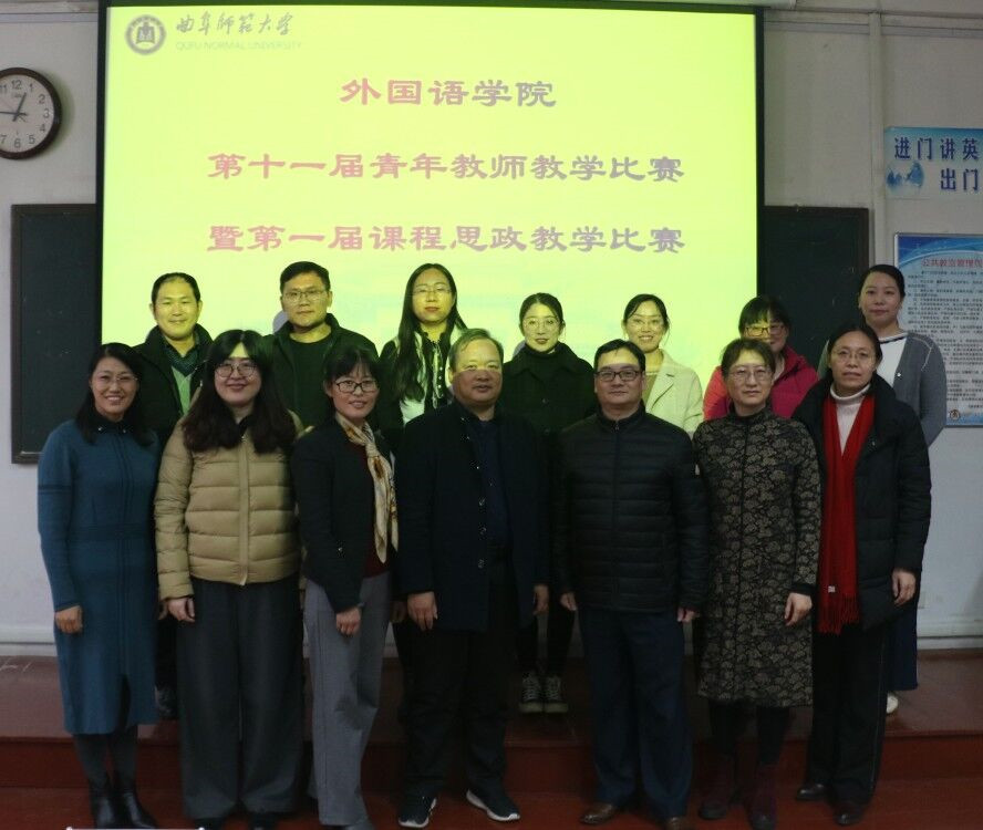 于12月6日上午在201教室举办第十一届青年教师教学比赛暨第一届课程思政教学比赛。本次比赛由院长助理高歌主持,季明举教授、寻阳教授、唐建萍教授,副教授张立昌,国际交流处牛香臻副处长,二外教研室主任郭婷婷老师出席并担任本次比赛评委,英、法、俄三个系共11位教师参赛。