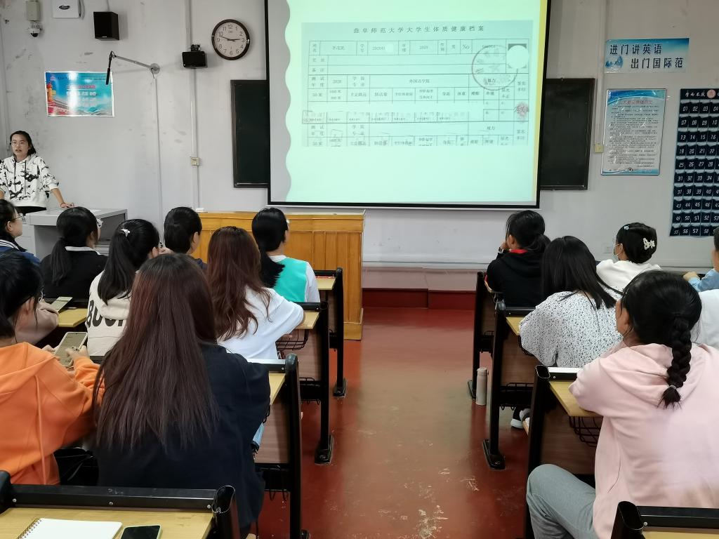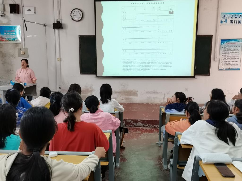 向同学们提出了高度重视健康测试工作、科学合理开展体育锻炼的倡议。同时,体育部讲解人员从测试前的准备工作,到体测中的身体素质、证件及着装要求,再到测试纪律等方面向同学们详细介绍了测试须知及注意事项。此外,会议重点向同学们介绍了体测表的填写规范、打印标准,以及体测成绩的评分标准和各项成绩占比。最后,在会议的提问环节中,体育部成员对同学们的问题进行了逐一解答。