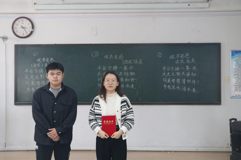 学生凭借过硬的综合素质,在黑板上留下了刚劲有力、酣畅大气的粉笔字,顺利地完成了比赛。随后,评委根据笔法、字法、章法、书写规范和书写效果对作品进行现场评分并做出点评。经过比赛的激烈角逐,评委老师分别为获奖同学颁奖。其中师范类赵晓娜、王晴同学,非师范类齐逸群荣获一等奖,获得一致好评。比赛在现场观众的热烈掌声中落下帷幕。