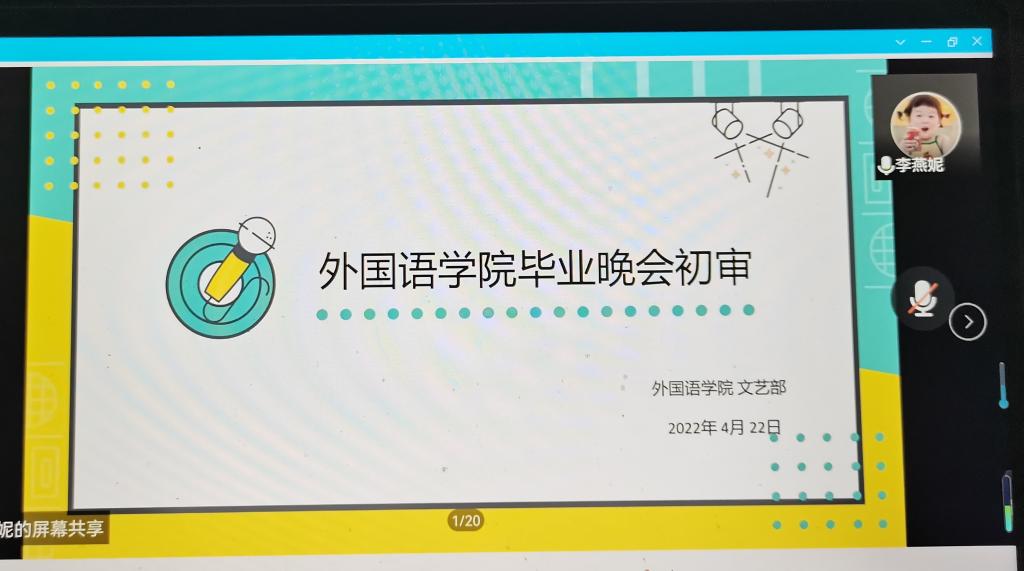 青春年华正飞扬,逐梦扬帆再起航。为了促进亚洲杯投注 2022年毕业晚会顺利开展,给18级外院学子留下美好校园回忆,4月22日晚,亚洲杯投注 文艺部于线上举办毕业晚会初审。亚洲杯投注 2020届学生会主席金文政、2022届学生会主席王孜淳、学生会副主席常汝馨、文艺部部长王晴担任此次初审团评委。