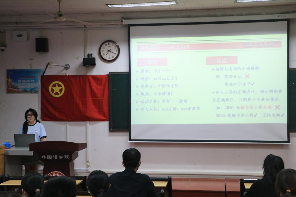 培训伊始,学生会主席王孜淳简要介绍了此次培训召开的目的,并向学生干部一一介绍了学生会主席团的成员与基本职务,有助于日后学生会工作中的交流,以便于提高学生会整体的工作效率。培训班上,团副韩铭瑞带领全体与会成员共同领悟《非凡百年》,鼓励青年学生向中国五四爱国运动中优秀学生代表学习,弘扬五四精神。紧接着,韩铭瑞又向大家分享了当代作家莫言致年轻朋友的一封信——《不被大风吹倒》,其中,莫言向年轻朋友提供了艰难时刻的解决办法,“道阻且长,行则将至”,与会青年学生纷纷点头,颇有感悟。最后,韩铭瑞向与会学生干部介绍了新时代青年马克思主义者的特质:忠诚的政治品格,浓厚的家国情怀,扎实的理论功底,突出的能力素质,要做到忠恕任事、人品服众。