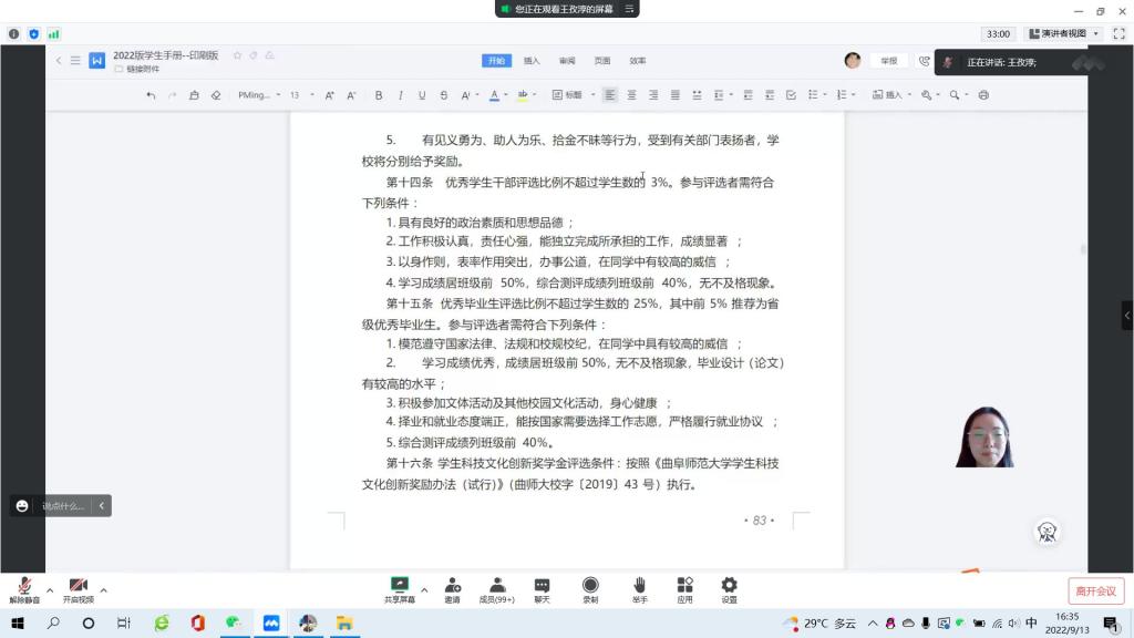 为使新生了解宿舍内务与卫生检查细则,9月16日,宿管部部长冷婷雯主持召开了“学生宿舍管理制度”讲座,讲解学生宿舍安全管理制度。经过短暂休息,宿管部部长冷婷雯与卫生健康部部长白家玮共同召开“宿舍内务整理和教室卫生”讲座,介绍卫生健康部门的工作和卫生检查细则。整个会议过程中,2022级的同学们表现积极,纷纷表示受益匪浅。