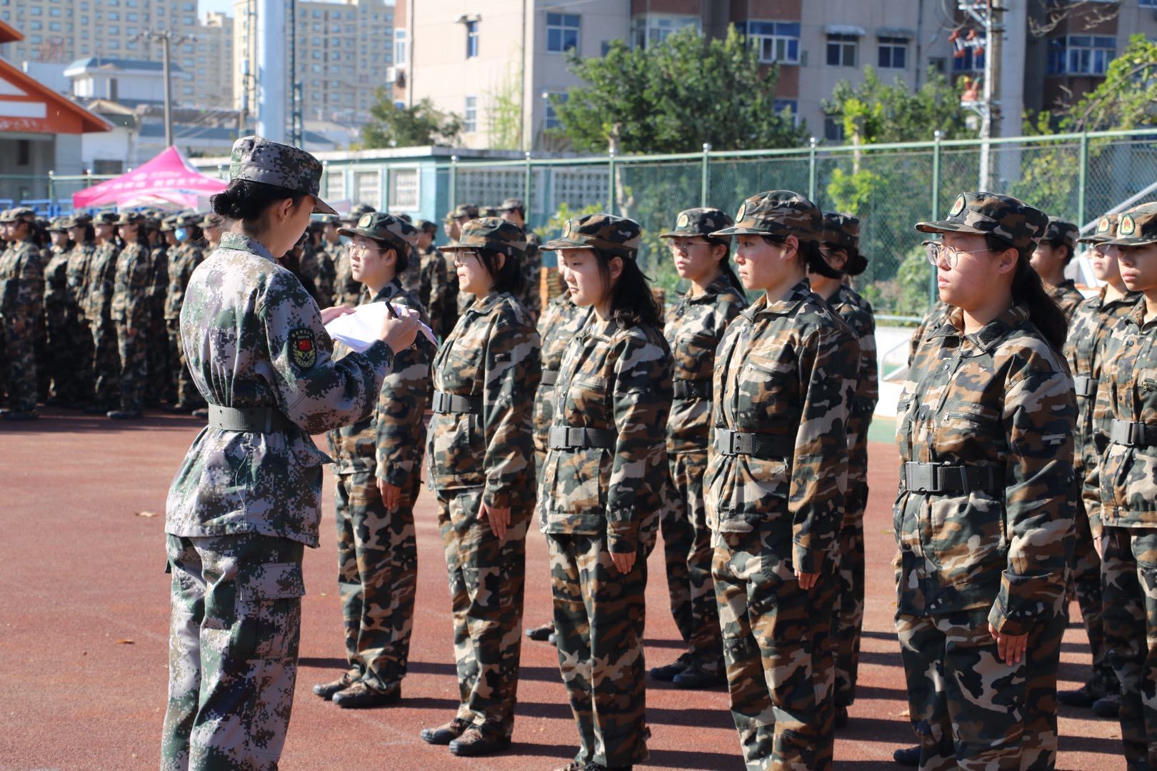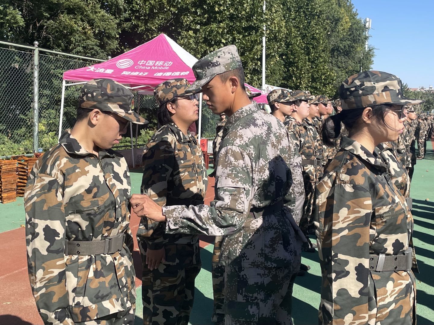初晨的阳光洒在迷彩服上,新生们朝气蓬勃,如青松般傲然屹立,斗志十足。立正,稍息,站军姿,摆水杯,整理马扎,一声命令下达,全部动作到位。站军姿时,同学们抬头挺胸,双手紧贴裤缝线。“向左向右看齐!”他们反应迅速,排列整齐。瑟瑟秋风里,同学们一遍又一遍地训练着,严肃而认真。大休时,新生们积极踊跃地进行才艺表演,动听的歌声和曼妙的舞姿飘扬在训练场四方。同时,在军训期间,亚洲杯投注