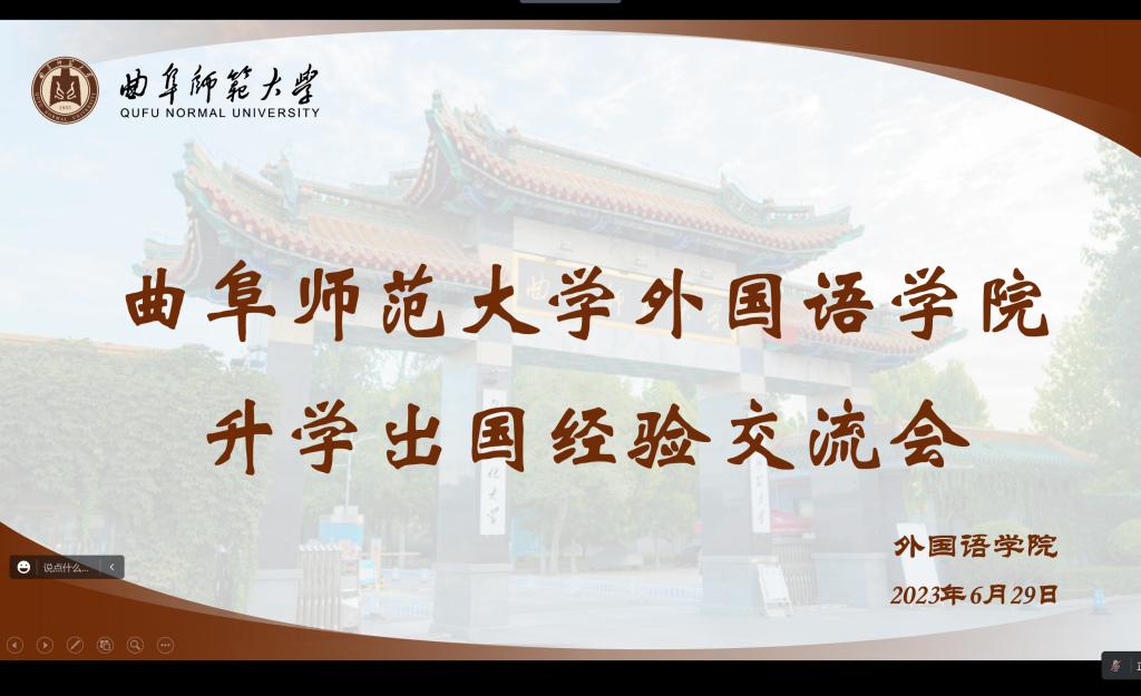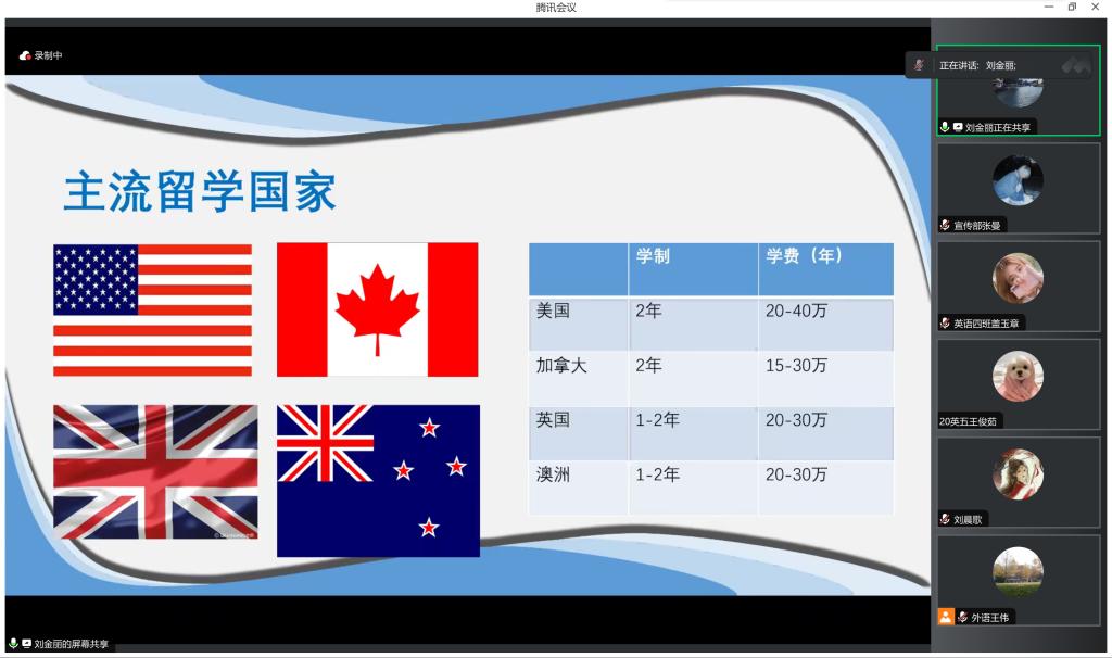 升学出国经验交流讲座以线上形式展开,由2020级辅导员王伟老师主持。会上,肖旸、王思瑶、张依然等同学分别就出国与升学申请事项进行经验分享。她们结合自身经历,提出了切实可行的意见,建议2020级同学们早做准备、提前规划。