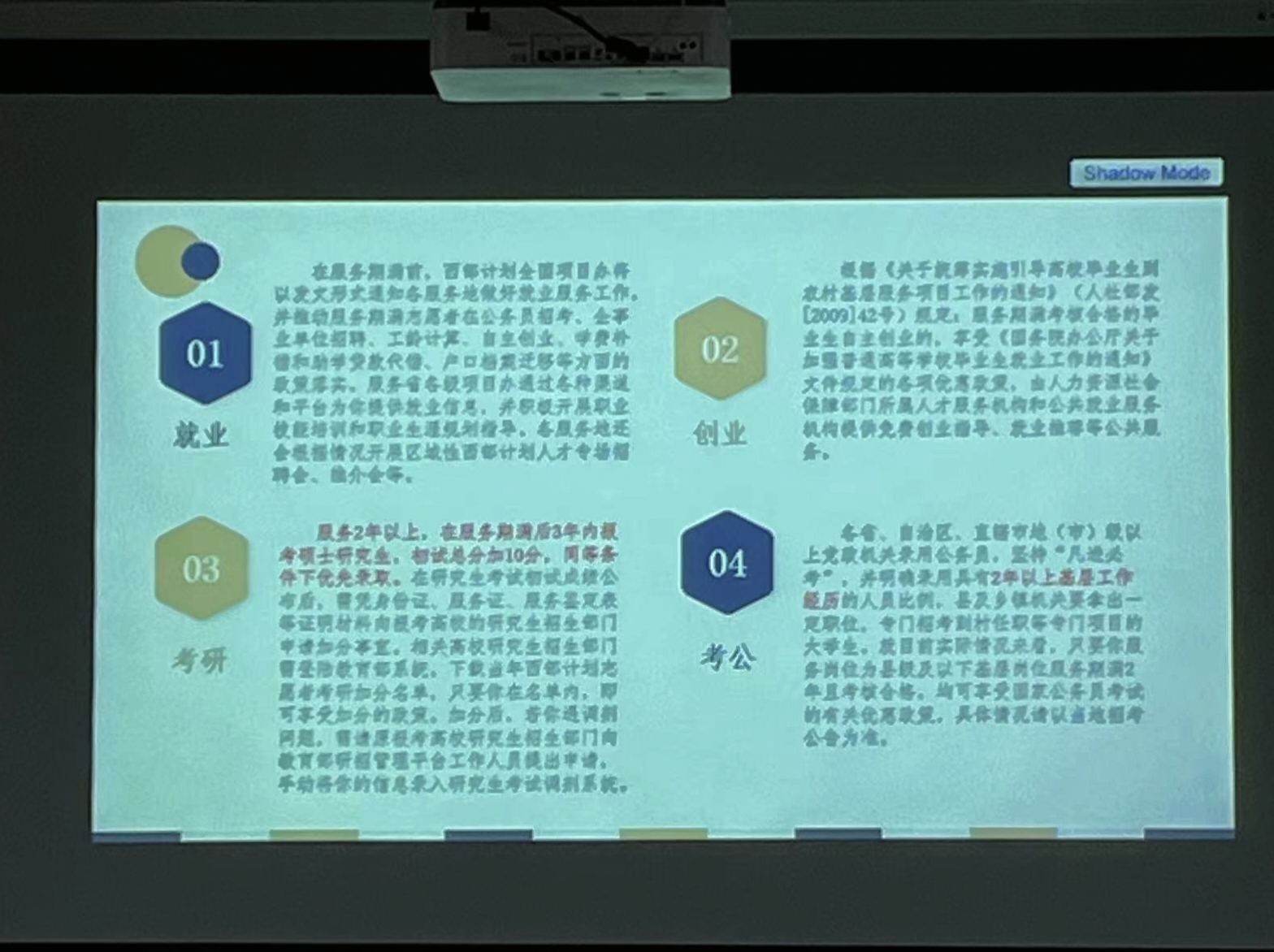 向下扎根泥土,向上迎接朝阳。本次宣讲会使同学们对西部计划有了更全面的认识,进一步弘扬了志愿服务精神,鼓励更多有志青年奔赴西部,投身基层,把梦想扎根在祖国和人民最需要的地方。