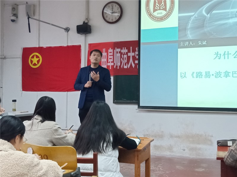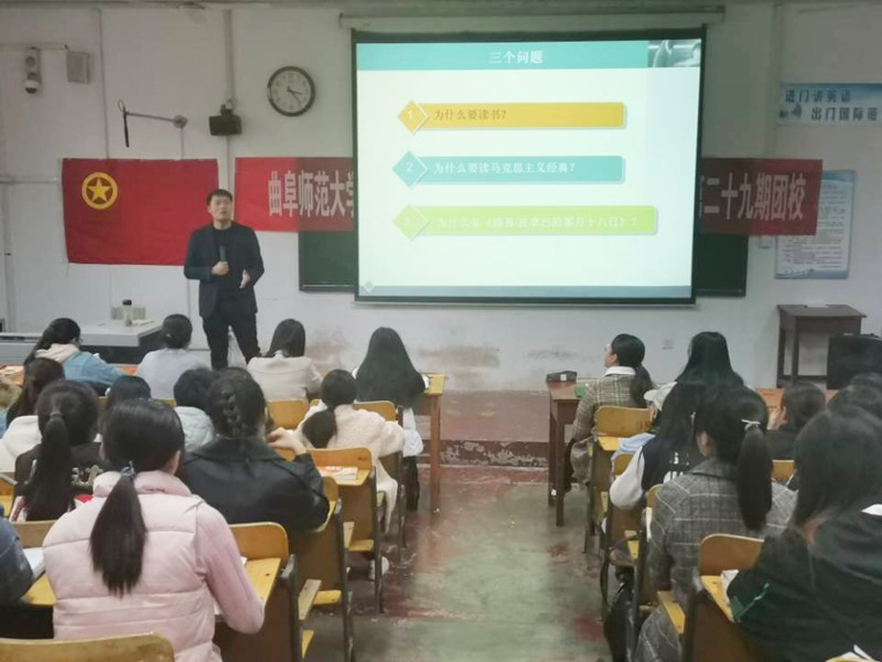 人为什么要读书?朱斌老师指出:一切有目的的读书都不是真正的读书。只有在静下来的时光里,读书的某一刹那,脑海里突然有了一束光,那才是真正有价值的读书。读书之于外语人,就如同肥料之于花朵,只有通过读书,人的思想才有内容,外语学习才会有研究、有深度。朱斌老师的一席话点燃了学生干部们深度学习外语的热情。相信学生干部们会鼓舞每位同学深入学习外语文化,学习外语的同学们也定会聚成一团火,合力将外语文化发扬光大。而读书又为什么要读马克思主义经典呢?朱斌老师引经据典,深度解析了新一代的我们面临的精神封闭、意识形态危机等问题。马克思主义经典正如一道光,学生干部们通过多读马克思主义经典,可以感受到思想的魅力,开拓大脑思维,进而端正意识形态。相信学生干部们在马克思主义的引领下,定会发挥先锋模范作用、带领班集体营造良好学风、让学生工作有条不紊的进行。