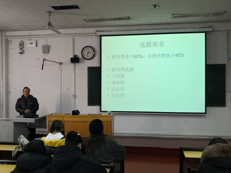 会议伊始,张立昌老师提出了论文选题要求,张老师着重讲解了如何选择外语教育教学类题目,并分别从习得类、调查类、实证类、对比类四个方面详细讲解了论文选题的方向,提出选题一定要按照自己的实际,量力而行。张立昌老师还提出了题目要求,强调题目要具体、简练、体现研究重点。最后,邢加新老师指出要多读文献来帮助确定选题,同时要避免题目重复率过高。邢老师用诙谐幽默的语言和生动形象的事例强调了毕业论文写作的重要性,要求同学们高度重视、认真对待,确保论文质量,交好本科学习阶段的最后一份作业。