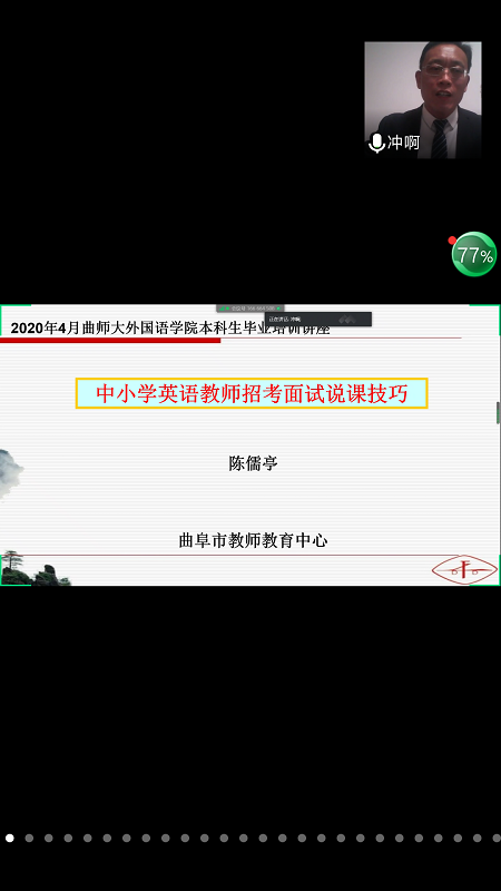 陈儒亭老师以“教师招考面试说课指导”为主题,从课程标准、核心素养、语音素质、常见课型、教学技能、组织原则和几点提醒七个方面展开报告。其中对常见课型和教学技能进行了详细的讲解,从阅读课和听说课的课堂设计来分享方法和技巧。期间播放了亚洲杯投注