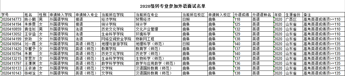 2020级转专业参加外语面试名单