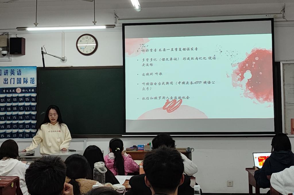 交流会上,英语专业耿鑫漪同学讲述了自己练习口语的经历,鼓励同学们通过看英美剧、听英文歌、学习特色口音等方式来提升口语水平。随后,孙文涛同学分别从课前预习、课堂听讲、课后复习三部分讲述了学习《综合英语》这门课程的方法,针对单词的学习和整理为同学们提供了权威的网站和参考资料。法语专业李彦祺同学分享了《基础法语》这门课的学习经验,并重点向同学们说明记单词、了解法国人文知识和提前预习的重要性。俄语专业齐逸群同学强调在日常的俄语学习中要注重单词发音的标准性,可以进行必要的模仿和跟读练习,最后分享了自己出国交流学习的经验。交流会结束后,同学们纷纷表示此次交流会帮助自己掌握了更加科学的学习方法,提升了自己在专业学习方面的信心。