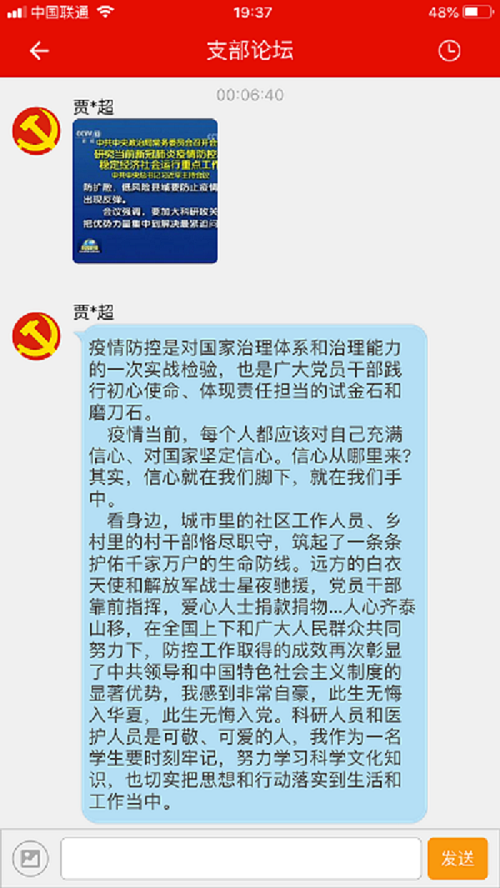 本次学习采取师生党员在家自学、支部督促检查的方式组织,3月30日全体党员完成视频学习,并通过自测模拟题目、支部论坛在线交流、分享心得体会等方式,进一步增强学习效果,互相激发学习热情。