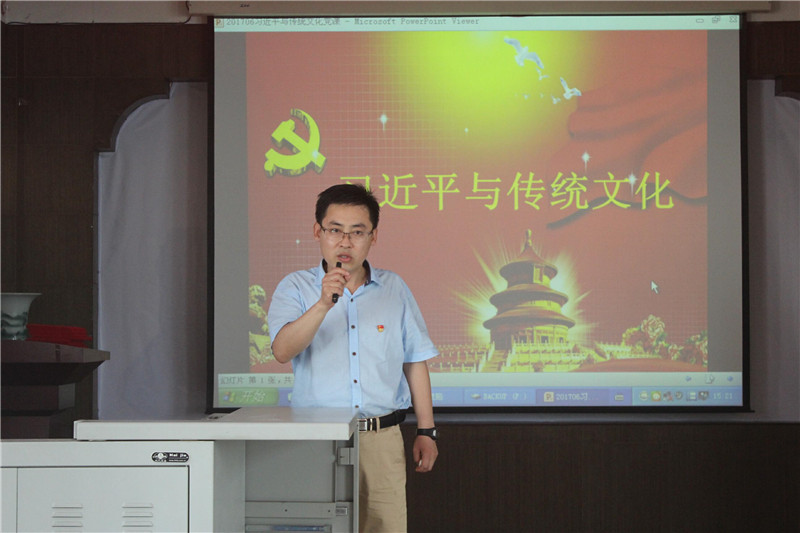 党委副书记曲凤东在二楼东会议室为本科生党支部全体党员上了一堂以“习近平与传统文化”为主题的党课。