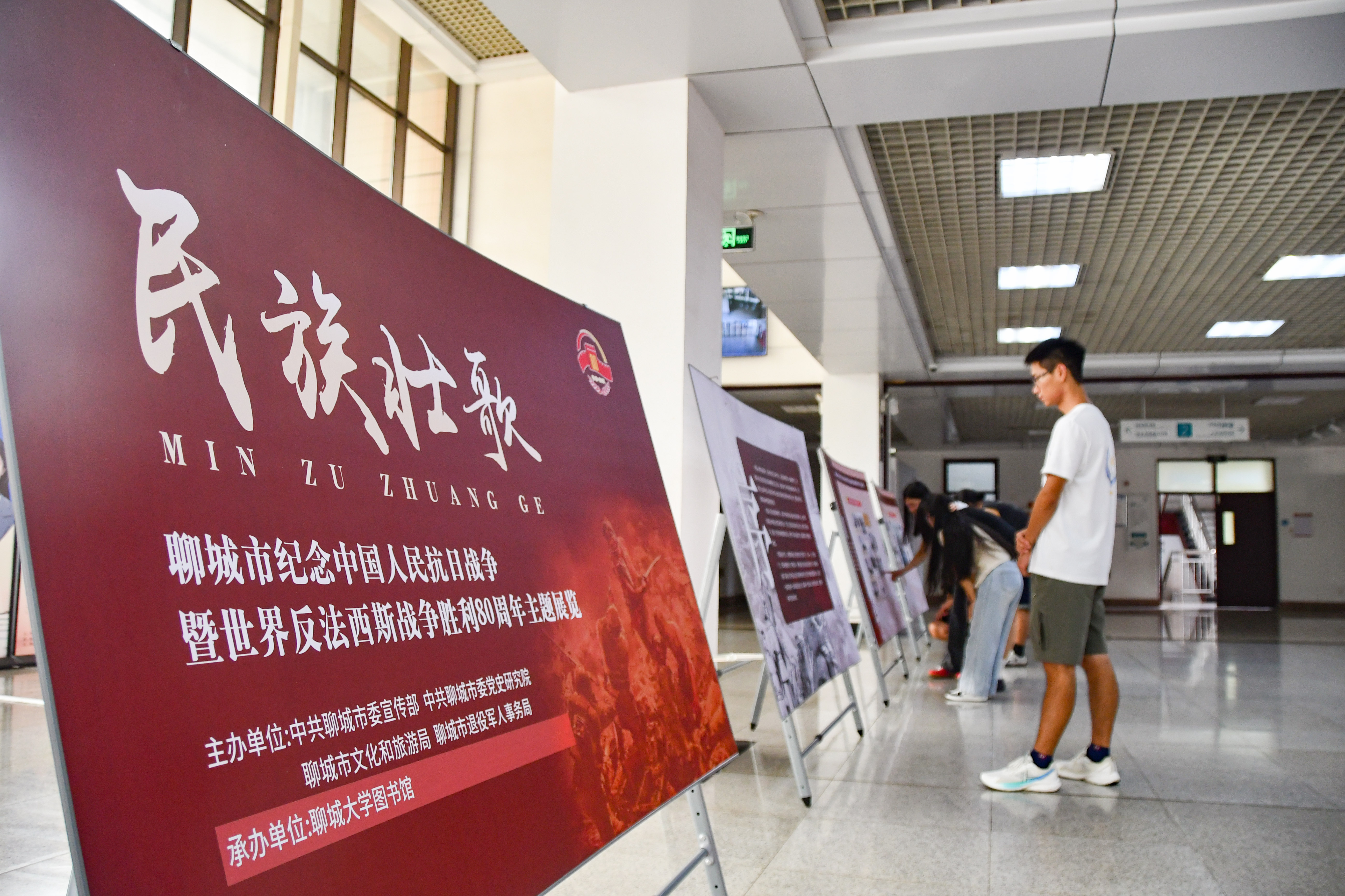 纪念中国人民抗日战争暨世界反法西斯战争胜利80周年之际,9月1日,聊城大学图书馆举办纪念抗战胜利80周年特展,特展分为三个分展览,包括中国人民抗日战争历史展、红色聊城的抗战史诗、抗战主题书展三个部分,位于东校区逸夫图书馆,这个“无声的思政课堂”吸引了众多聊城大学师生前来参观。