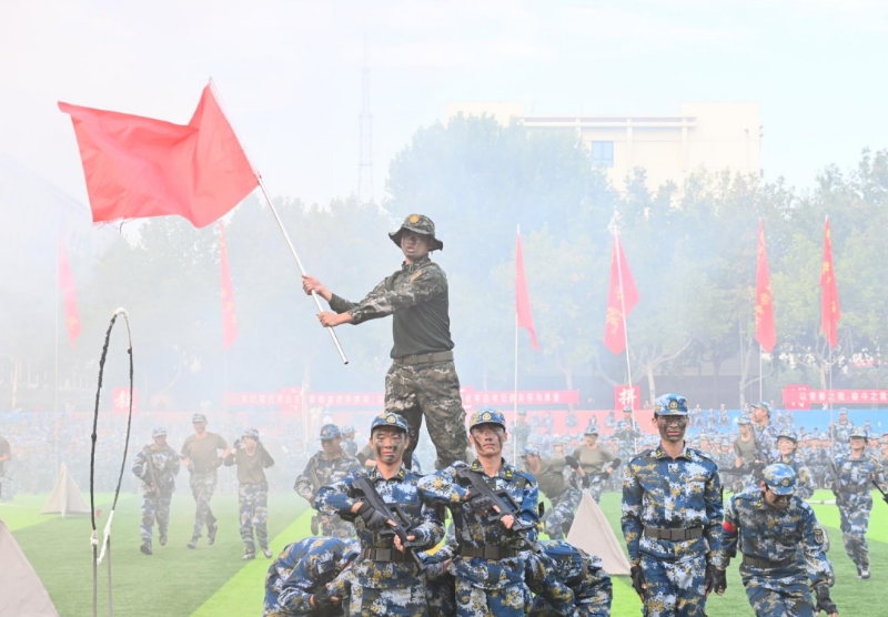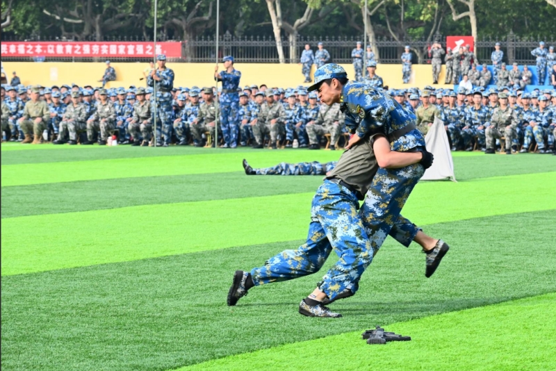 伴随着国歌雄壮激昂的旋律,鲜艳的五星红旗冉冉升起,迎风飘扬,军训总结大会拉开序幕。党委书记关延平发布指令后,各方队依次进行军训队列展示、刺杀操、捕俘拳、匕首操、战术演练等军事技能训练科目汇报表演。同学们动作整齐划一、口号铿锵有力、表演气势如虹,展现出良好的军事素养和训练成效,赢得现场阵阵掌声。