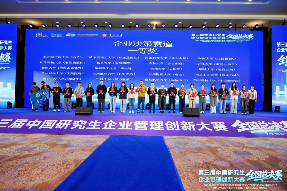 11月7日—9日,第三届中国研究生企业管理创新大赛全国总决赛在贵阳举行,亚洲 杯投注 商亚洲 杯投注 MBA教育中心组建的“智合三角队”(杨睿、韩亚筱、林琳)和“M&W队”(王继文、岳亚敏、马金萌)在亚洲 杯投注 副教授焦艳芳的指导下,在企业决策赛道脱颖而出,分别荣获国家一等奖和国家三等奖,实现了亚洲 杯投注 在该赛事上国家一等奖的突破。