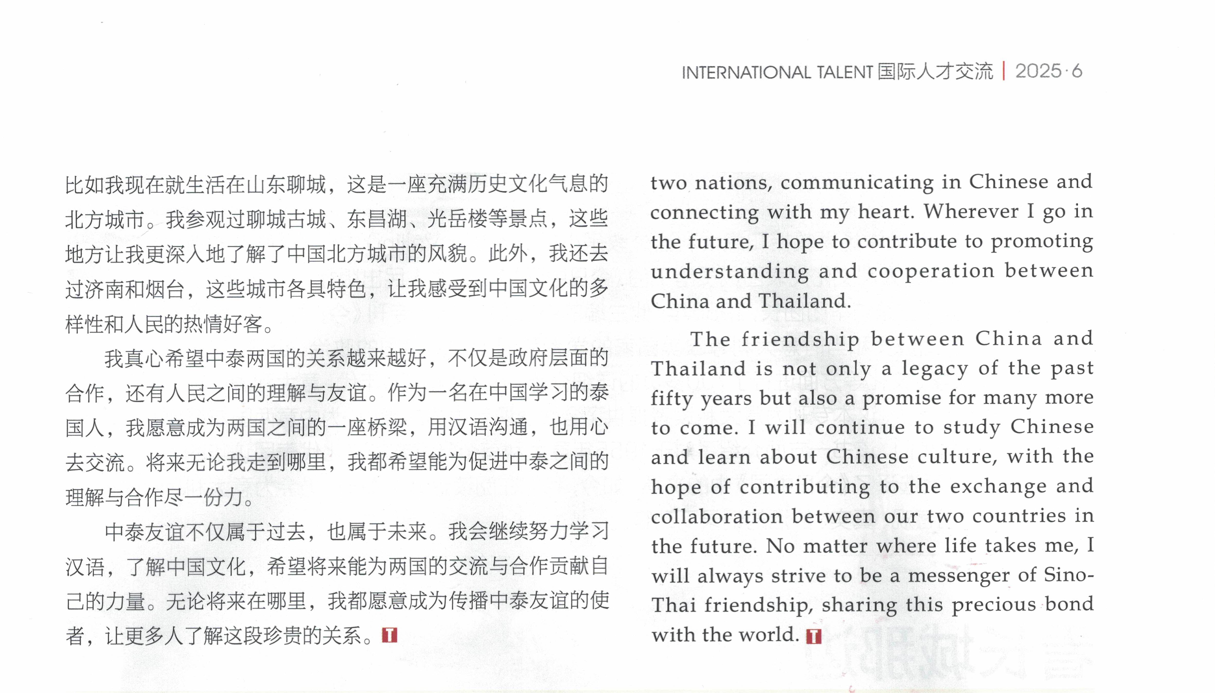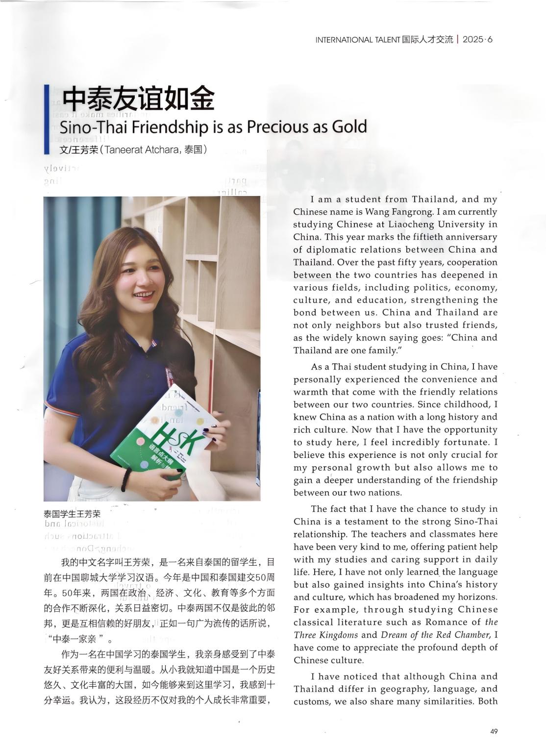 今年是中泰建交50周年。亚洲 杯投注 泰国留学生王芳荣在《国际人才交流杂志》发表题为《中泰友谊如金》的文章,讲述自己在聊城大学学习中文、感知中国的经历和青年文化交流与互鉴的故事。