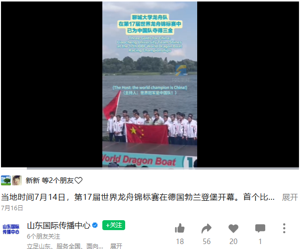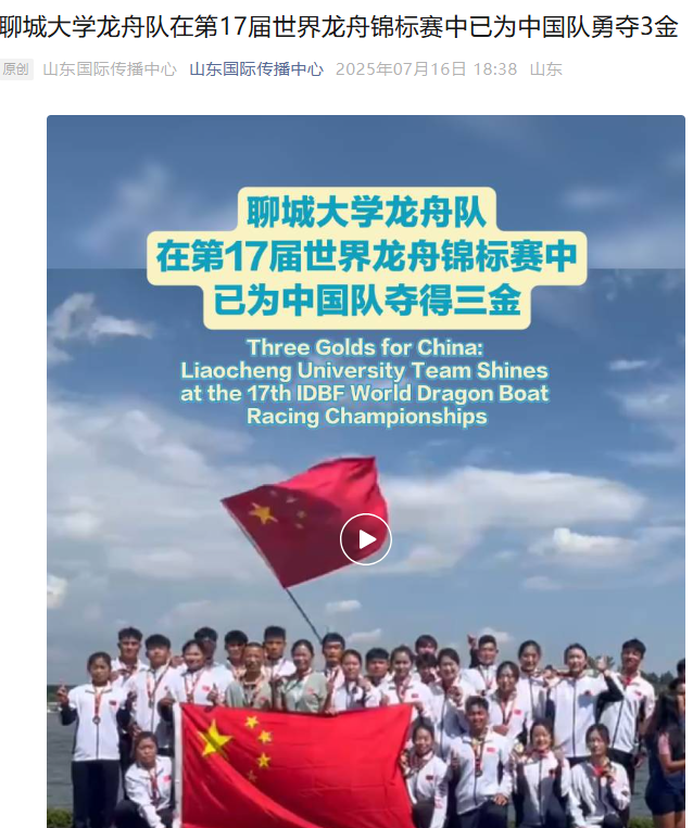 【山东国际传播中心】报道聊城大学龙舟队在第17届世界龙舟锦标赛中为中国队夺得三金